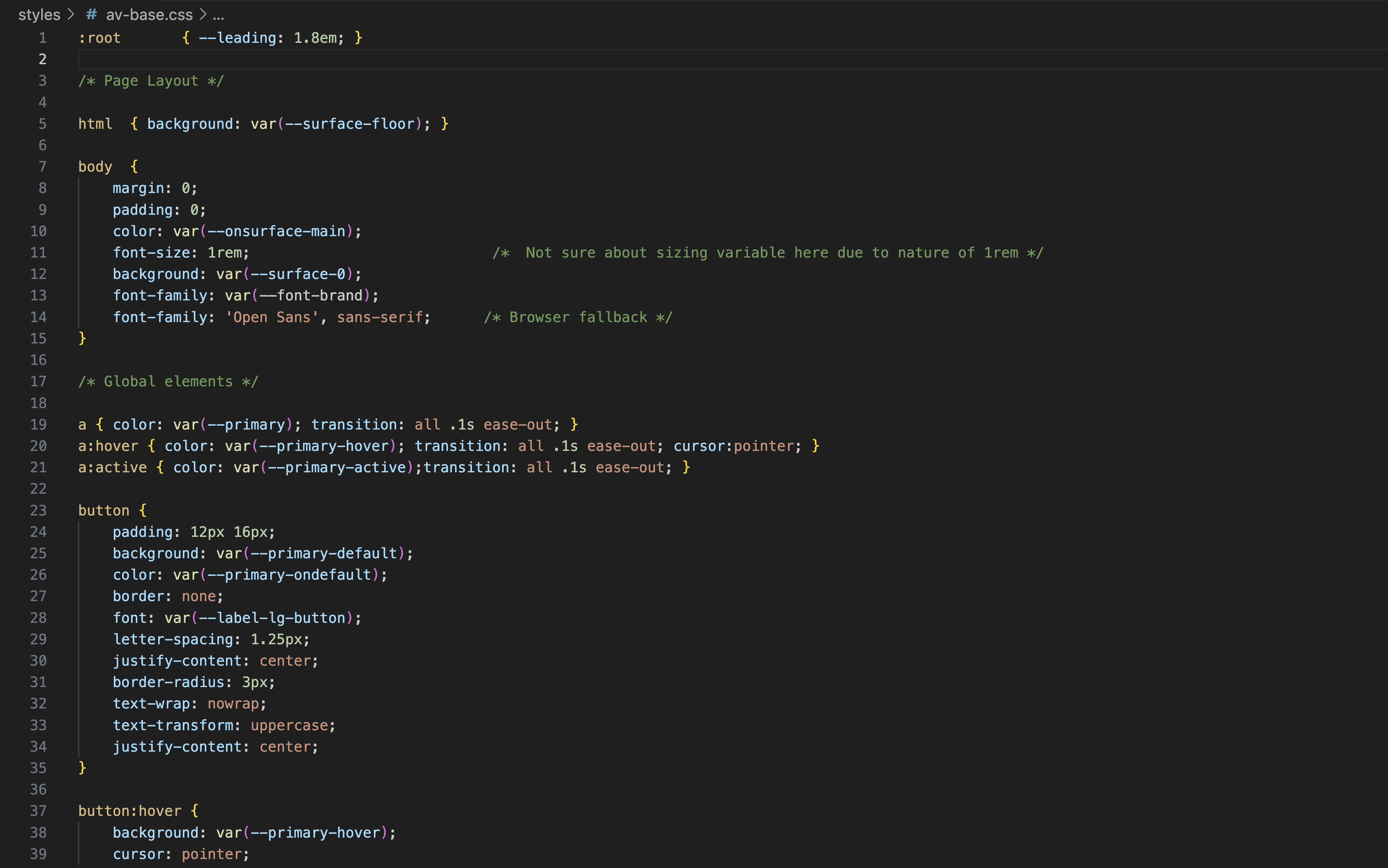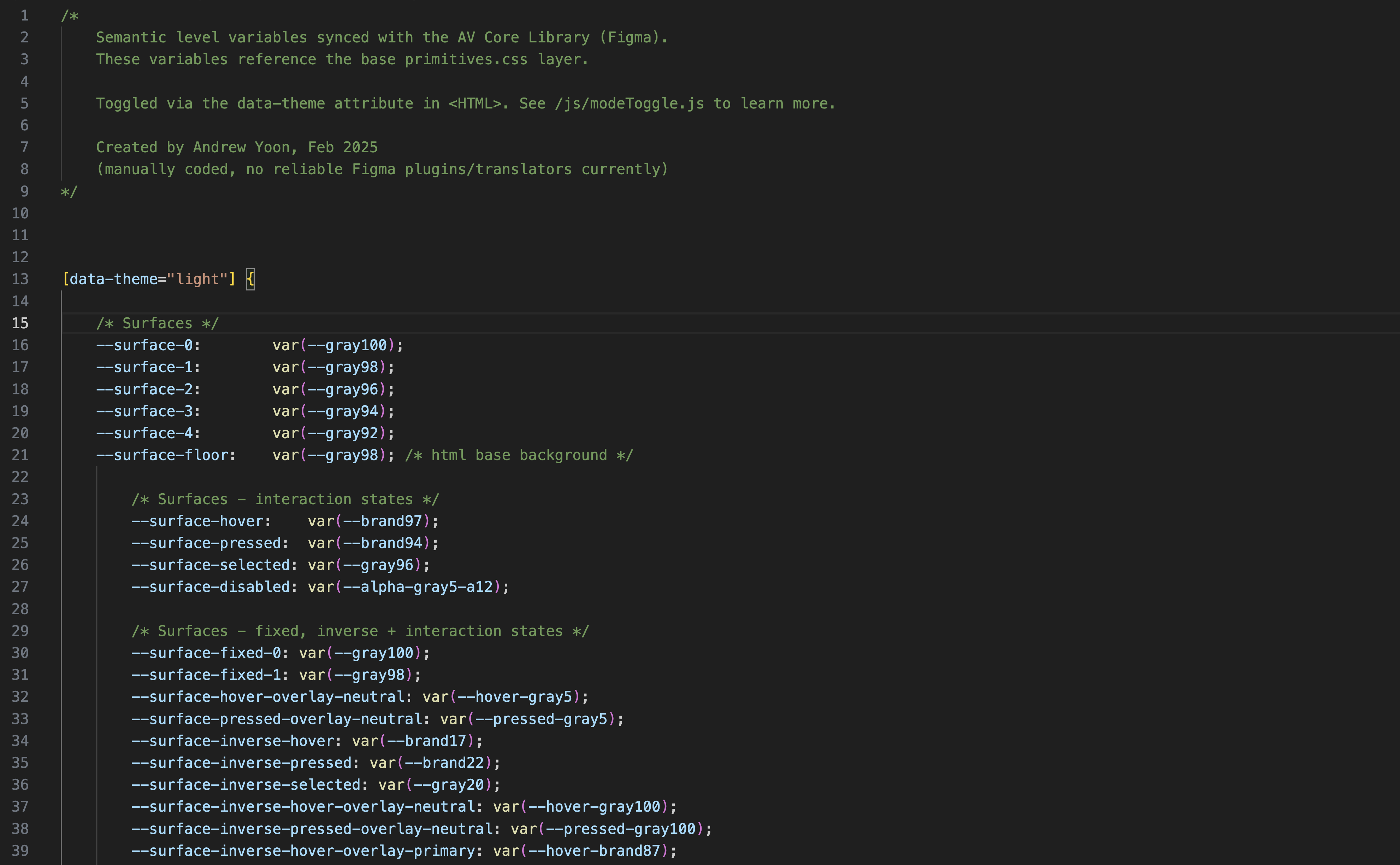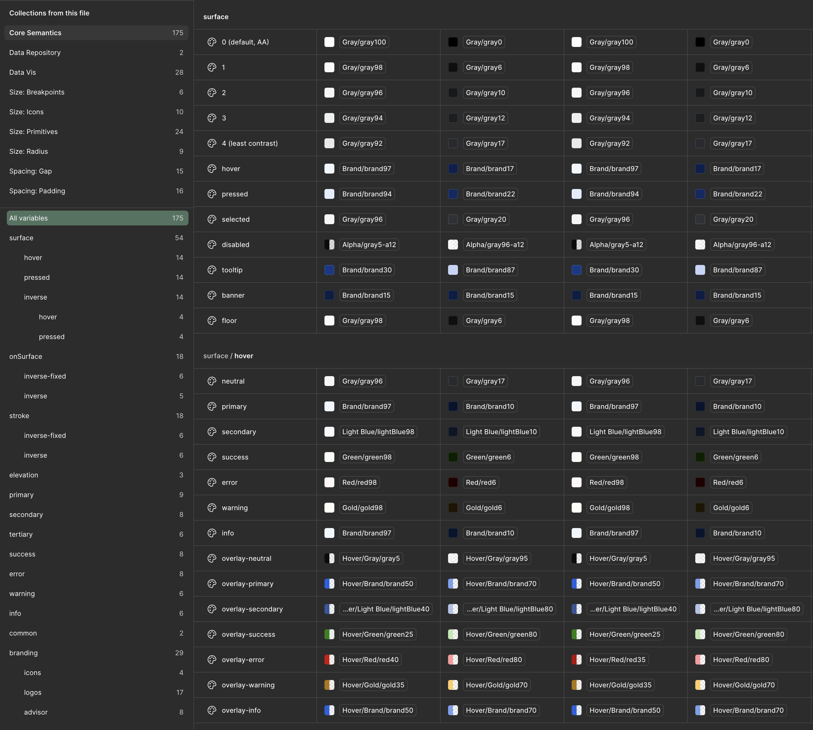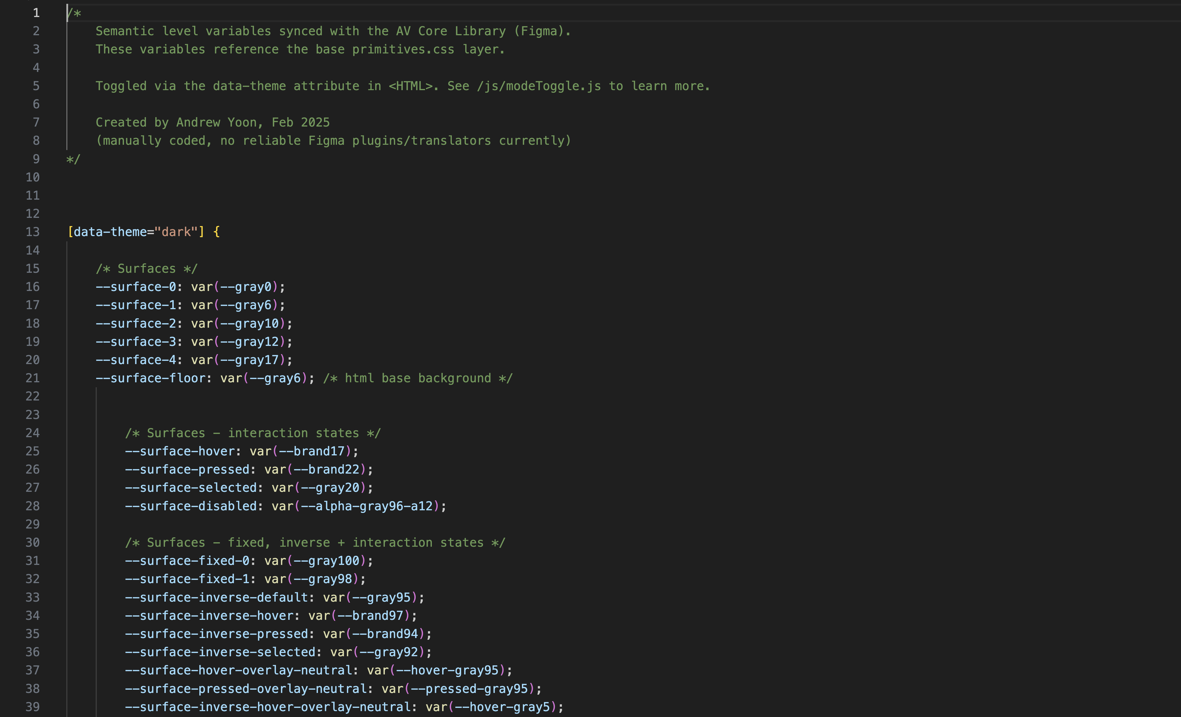 AccountView follows naming standards adopted by Figma/Google/Atlassian and other industry thought leaders. Much can be said about how to name these variables and how to organize their structure. But in short, they need to be maximally efficient to understand and scale, with their heiharchy and organizing logic built into their name. For what I call "semantic pairings", AV uses the "on" prefix, popularized by Google/Figma (not sure who did it first). So if you're using a certain type of surface, you know it's corresponding "on-surface..." goes with it. The ensures its intended usage and accessibility compliance.